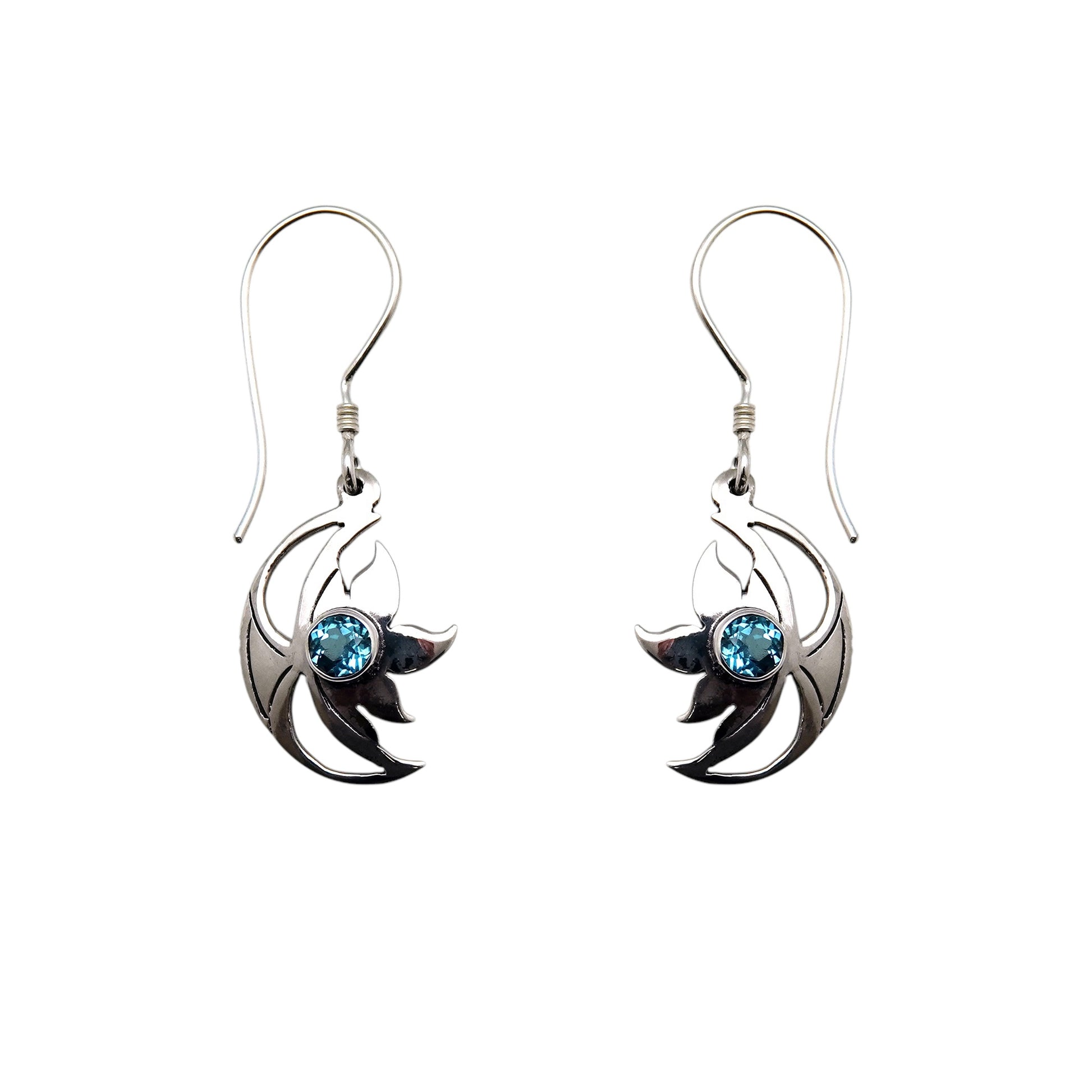 A new addition to our celestial collection, this design shows a dominant moon with sun peering from beyond. Other features include cut outs and a 4mm round Swiss blue topaz. 1 1/2" x 5/8"