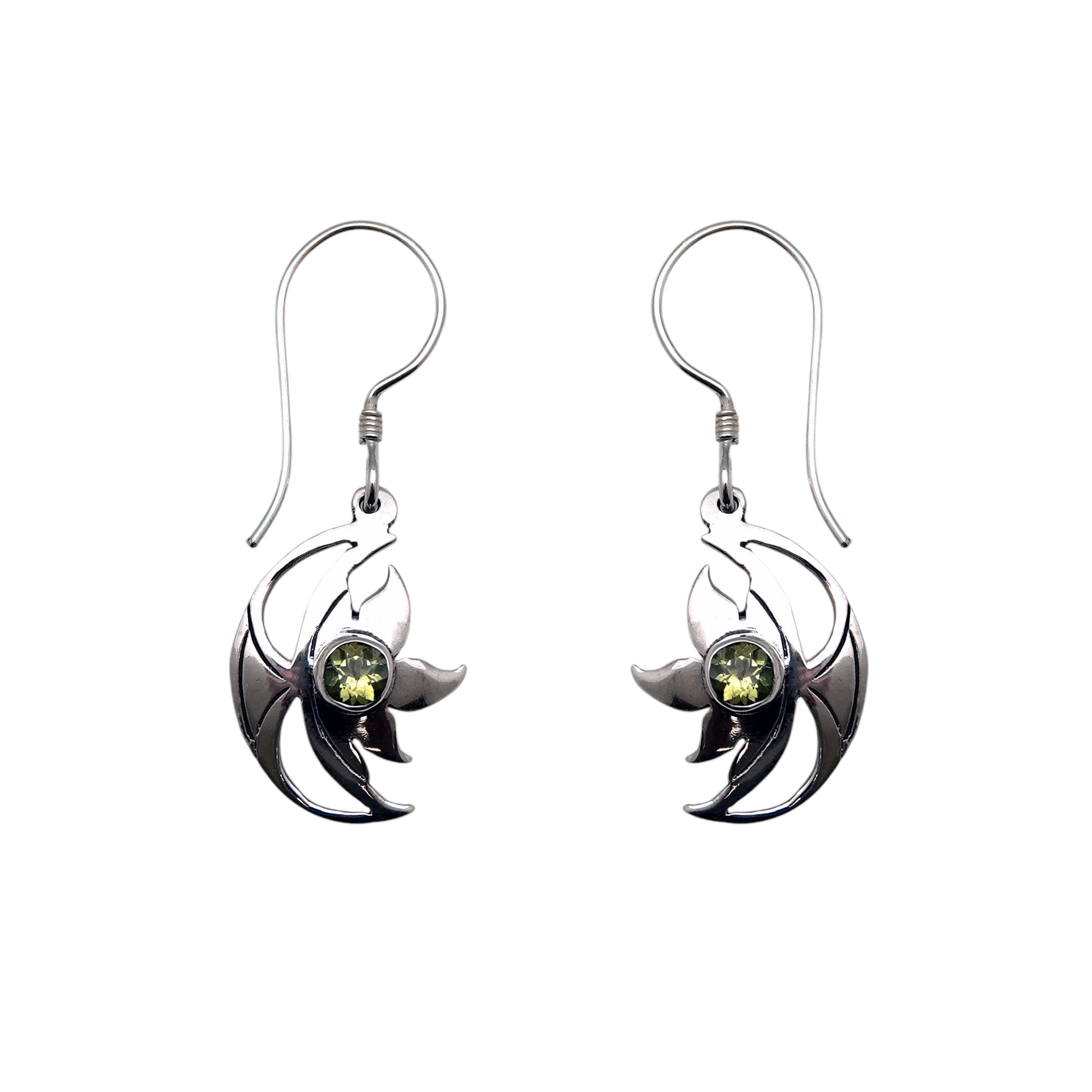 A new addition to our celestial collection, this design features a dominant moon with sun peering from beyond. Other features include cut outs and a 4mm round faceted peridot. 1 1/2" x 5/8"
