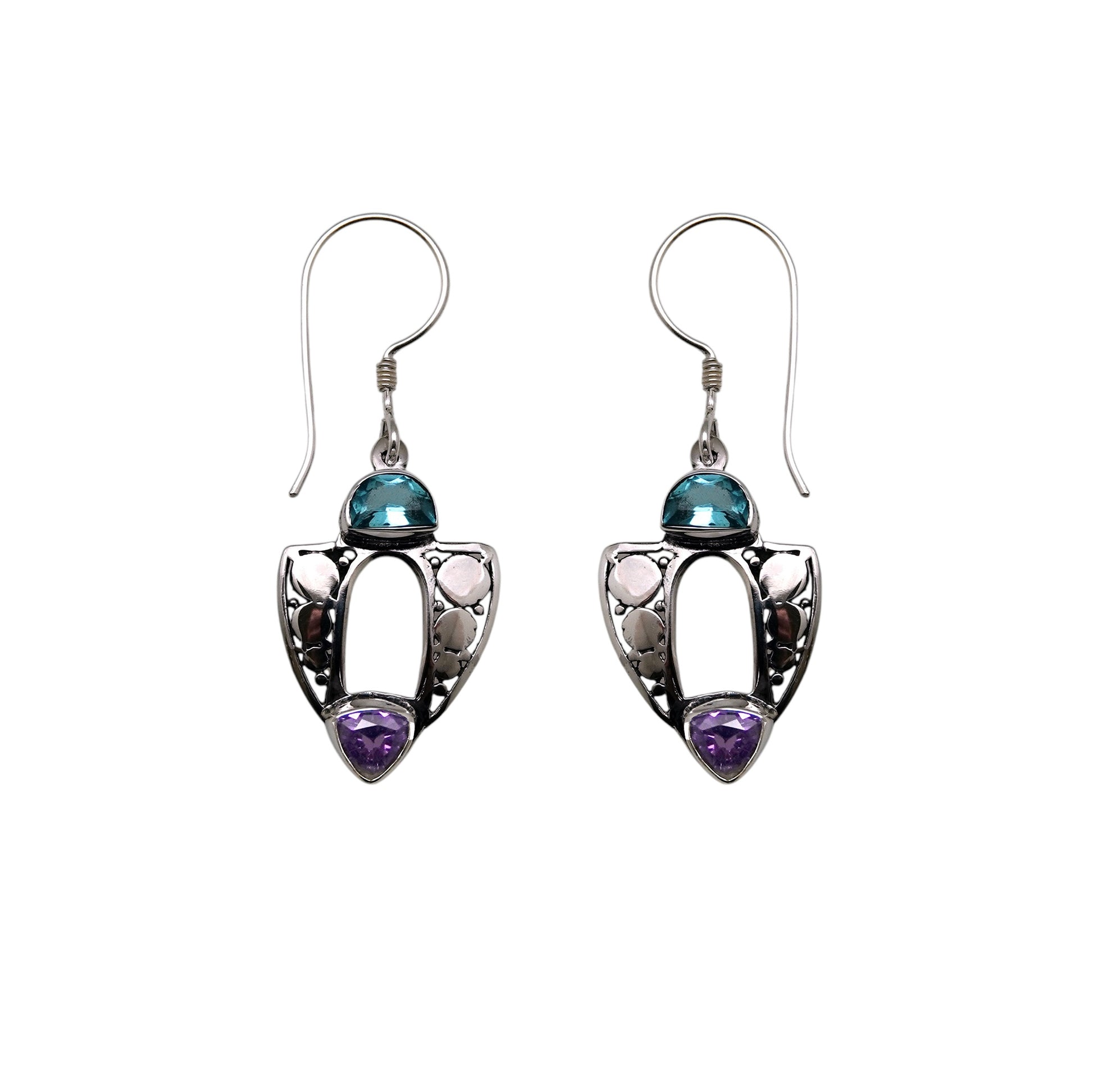 Our uncertain future is the impetus for this obscure illustration; head atop, heart below, spirit shifting within the hollow between. It is a delicate alliance in the governance of our existence. Should one hold sway too long, life in the center becomes fragile, too vulnerable to the dictates of its ruler. It is a precursor of spiritual mortality, reminding us to always strive for balance in the seesaw between heart and mind. Featured here in blue topaz and amethyst.