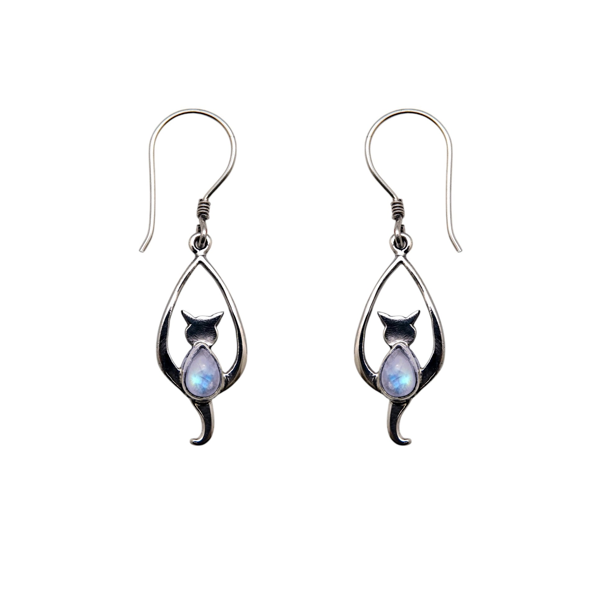 A sitting cat, swinging in a frame gradually tapering in teardrop form from bottom to top. It's the subtle details that make a simple design attractive. Featured here in blue moonstone