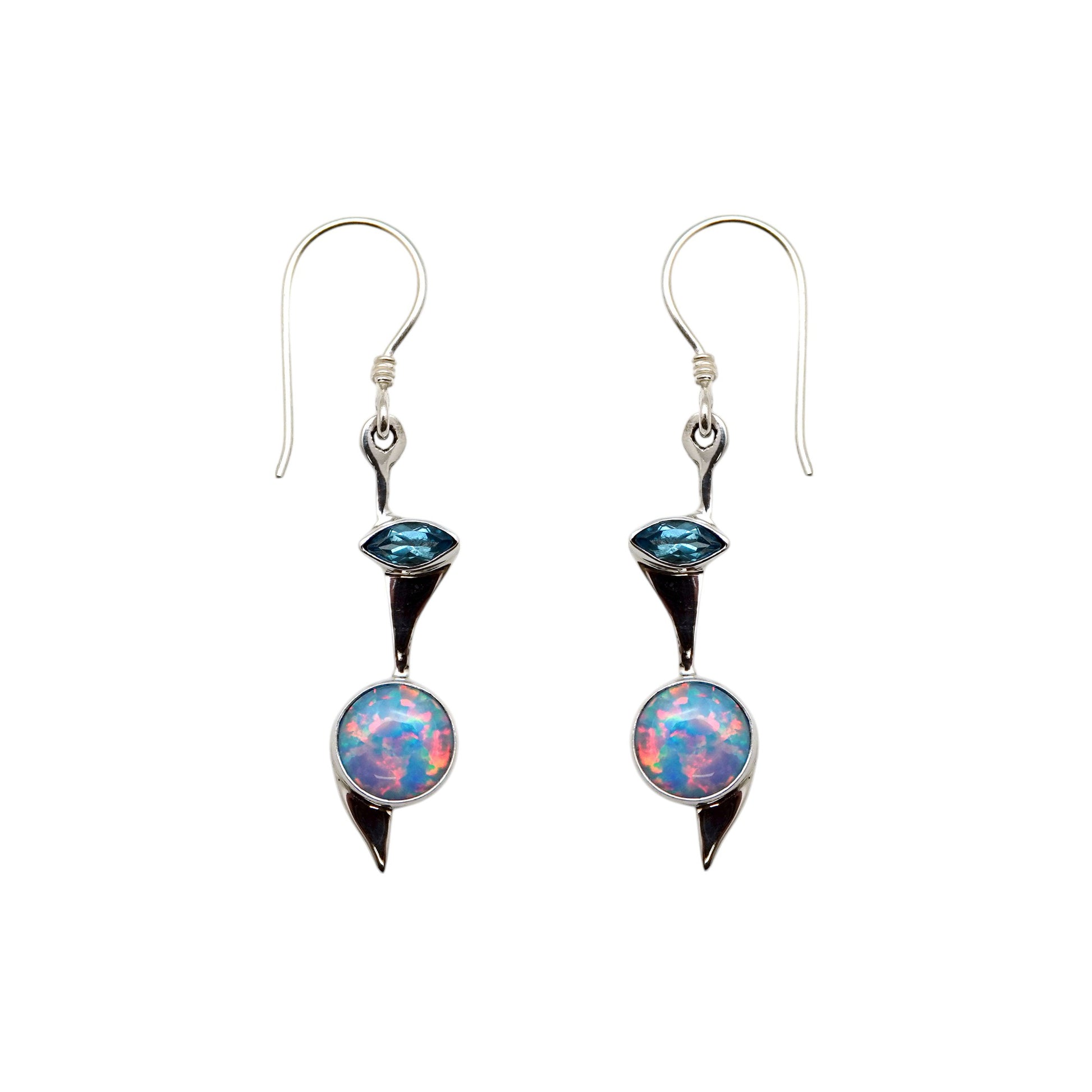 Geometric forms influence our new multistone creation while curves and angles hewn in silver complement the colorful stones they frame. Shown here in Swiss blue topaz, accenting an 8mm round blue opal (lab created).