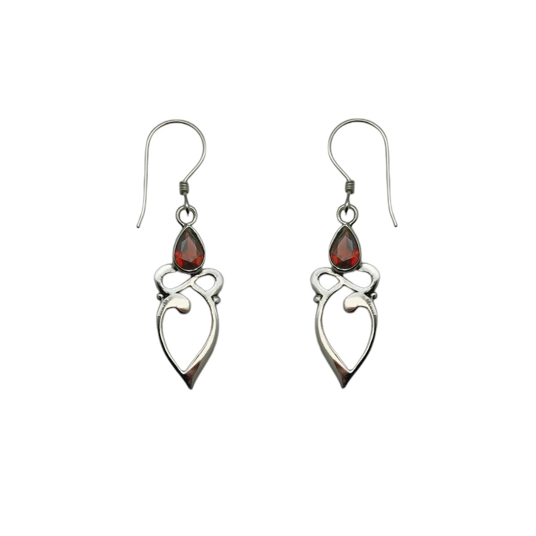 A loose interpretation of infinity rests above two graceful swirls of silver. On top of everything sits a faceted garnet.