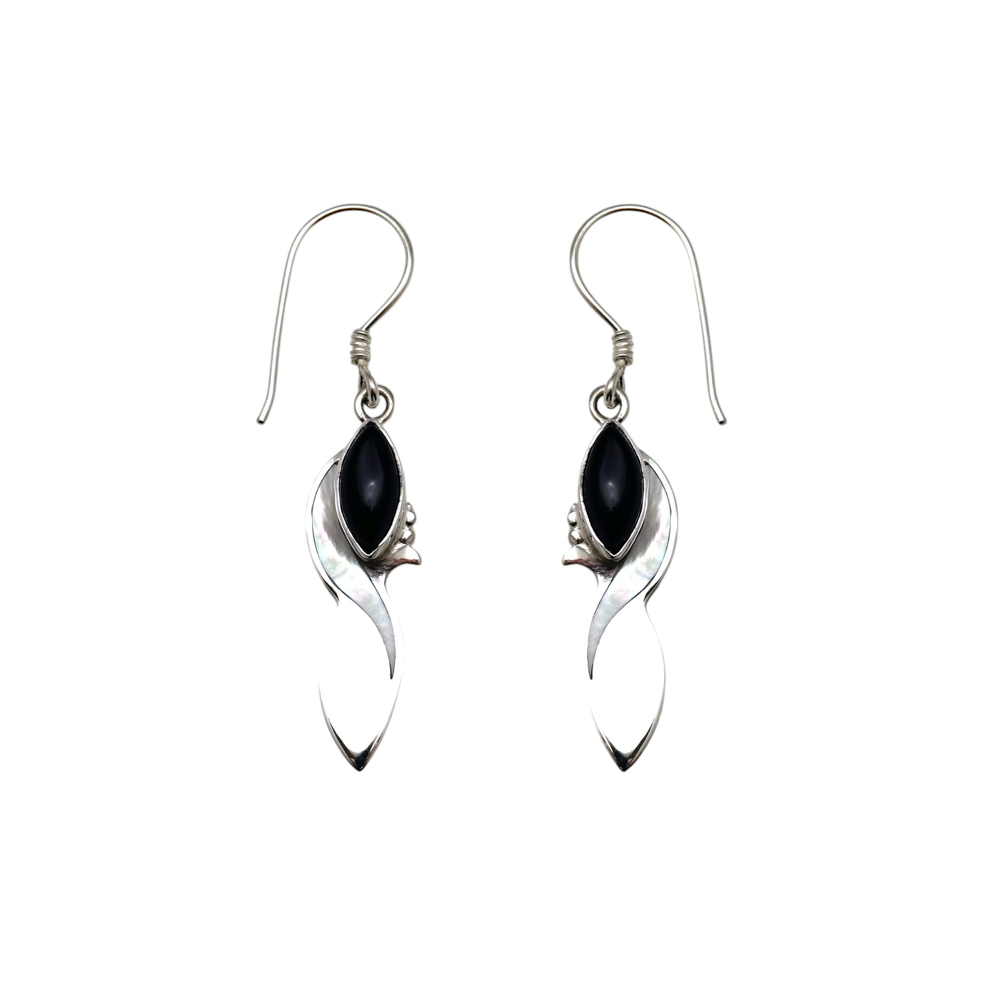 Slender siblings in a classic black/white color contrast, featuring a shiny black onyx overlooking a lustrous mother of pearl, mirroring its image from below. The onyx, a 5x10mm marquise, will only be available in limited quantities.