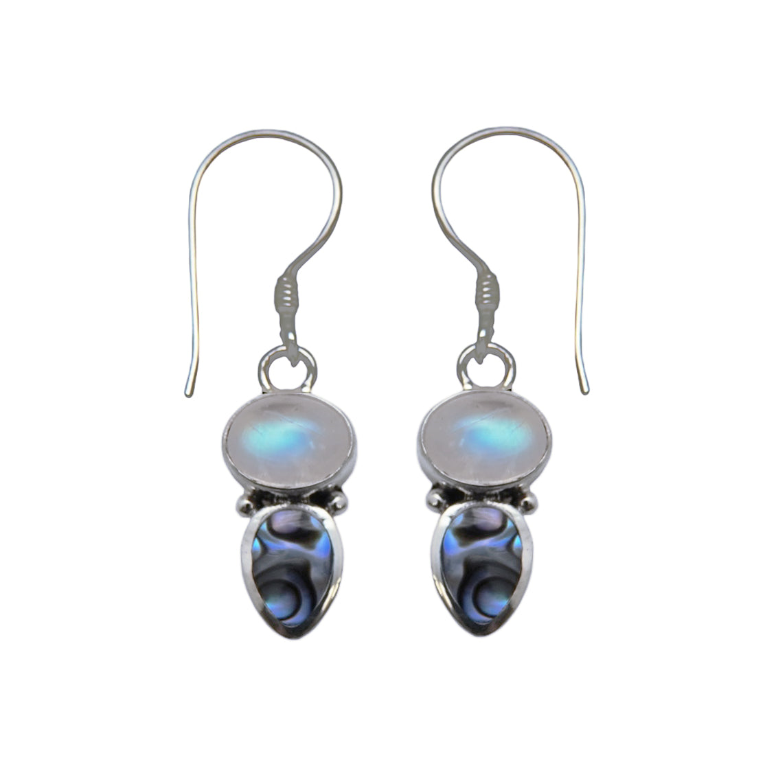 This compact multi colored earring features a natural blue moonstone mated to a New Zealand paua shell. A popular choice, whether for professional or social occasions.