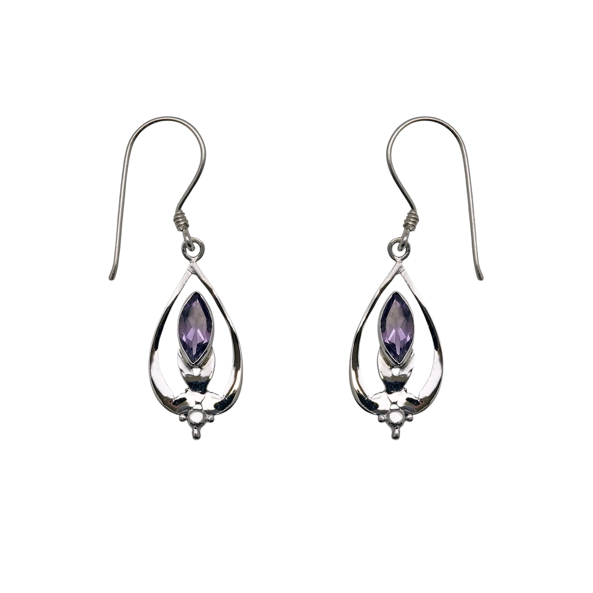 These Vera Wolf earrings feature an airy, teardrop-shaped silver frame that cradles a bright marquise-cut Amethyst at the center. Delicate sculptural detailing at the base adds a touch of artistry, giving the pair a graceful, refined look with a pop of vibrant color.