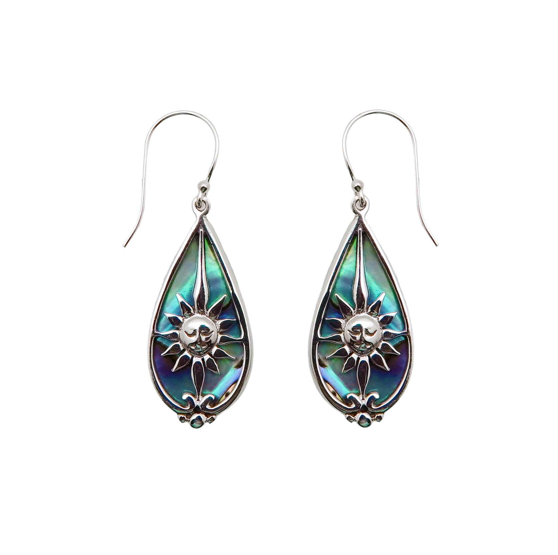 Sterling Silver Sun with Paua Background dangle earring.