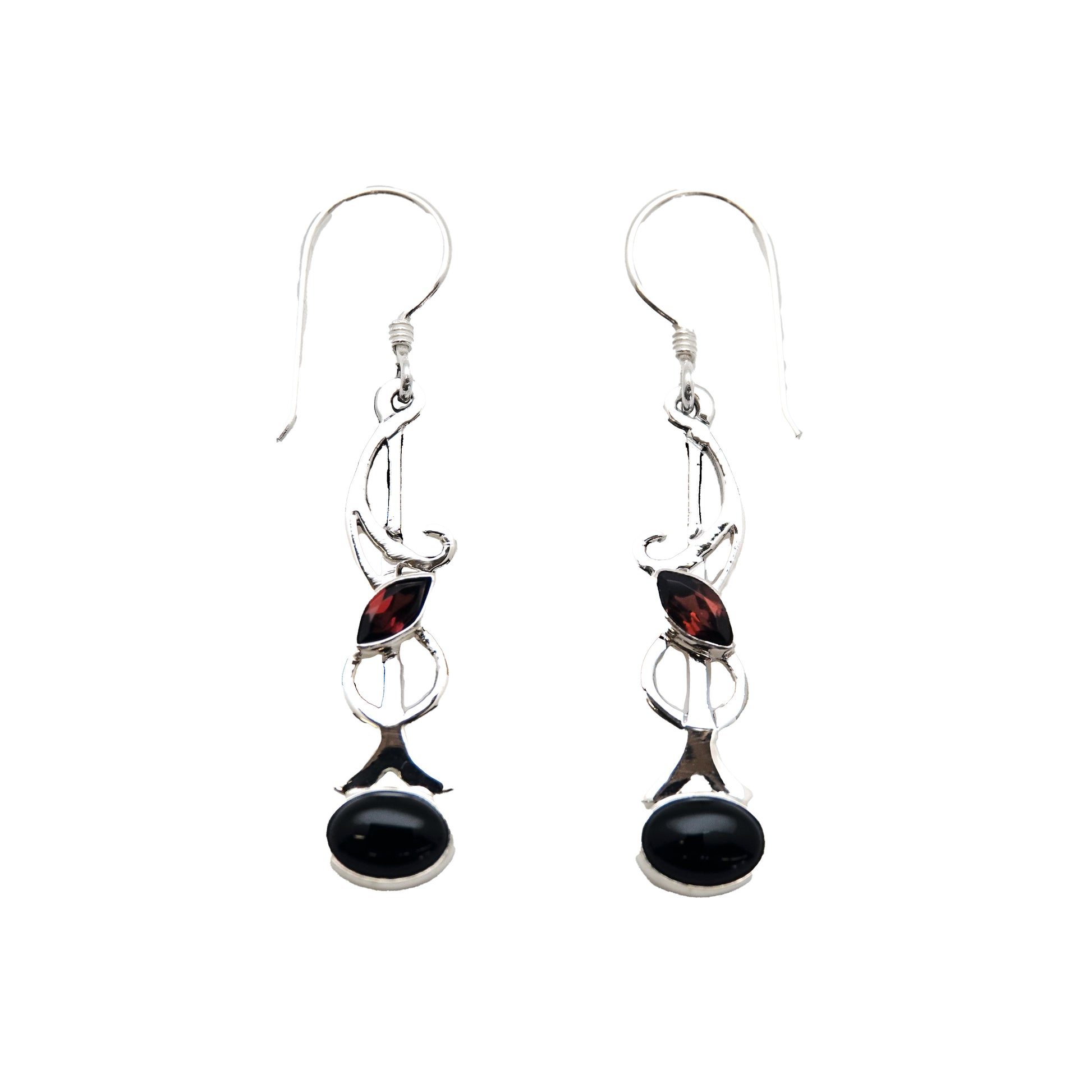 Flowers inspired this graceful earring design, shown here in black onyx, accented with Mozambique garnet..