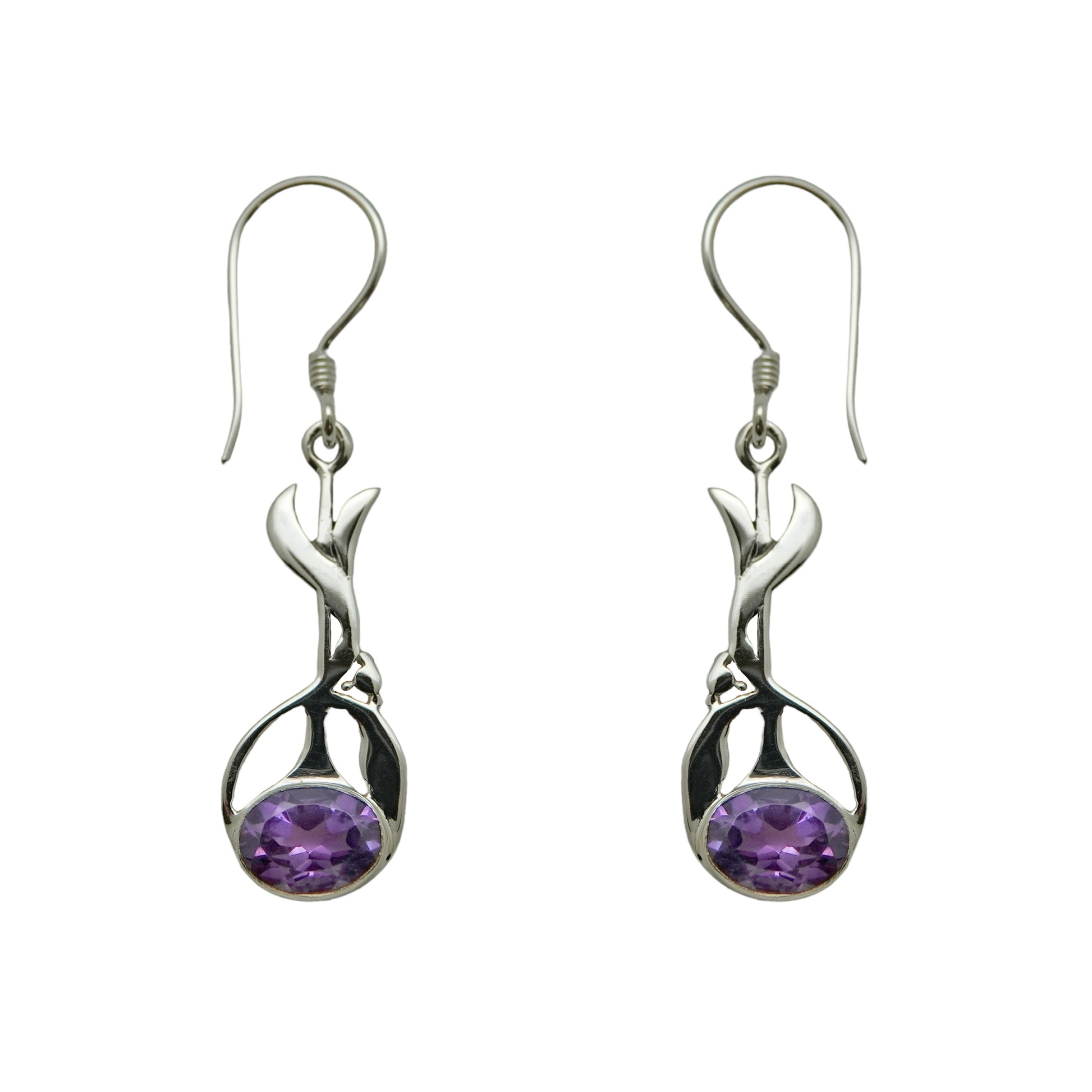 A climbing vine inspired this hand crafted drop earring in sterling silver, shown here in a 6x8mm oval faceted amethyst (3 carats total weight).