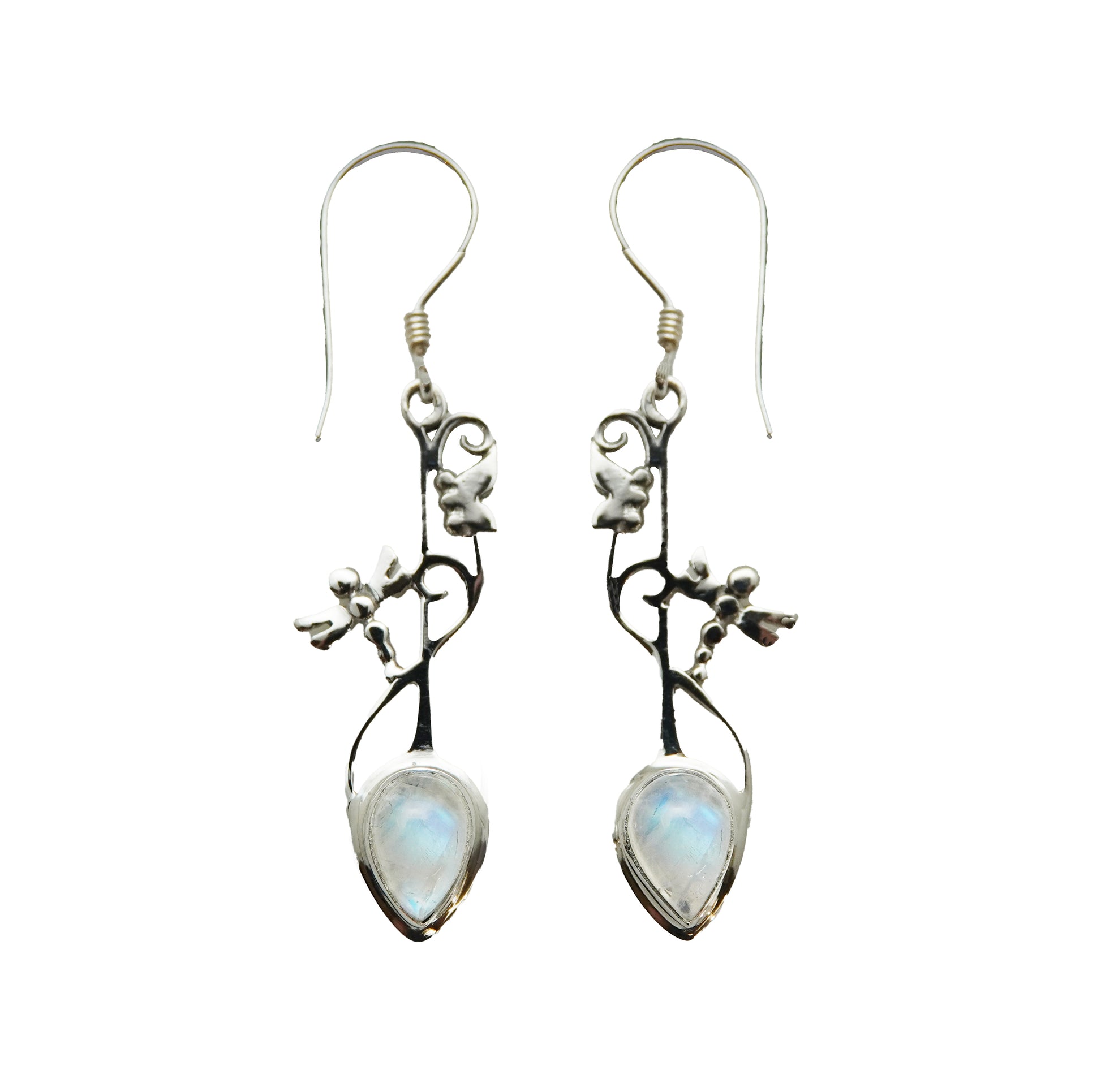Dragonflies and butterflies weave their way through this serpentine dangle earring, featured here in natural blue moonstone.