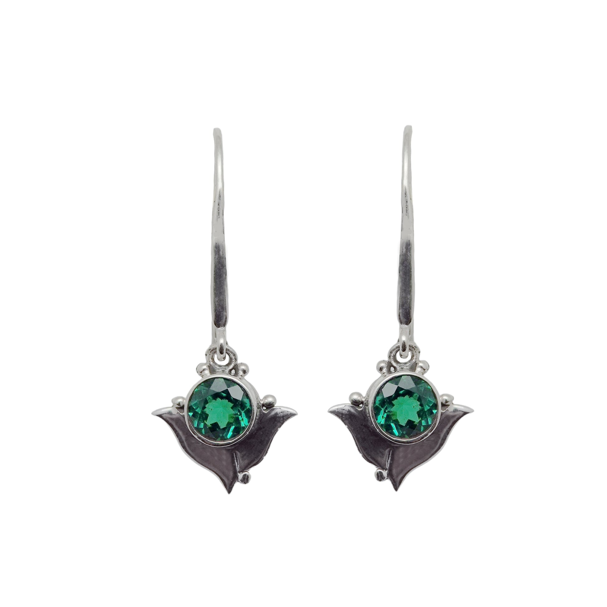 This silver earring boasts an elongated French hook and a 6mm round emerald green quartz. This sparkling emerald green earring will be noticed and admired, despite its relatively diminutive proportions; apropos for the office yet flashy enough for a night on the town.