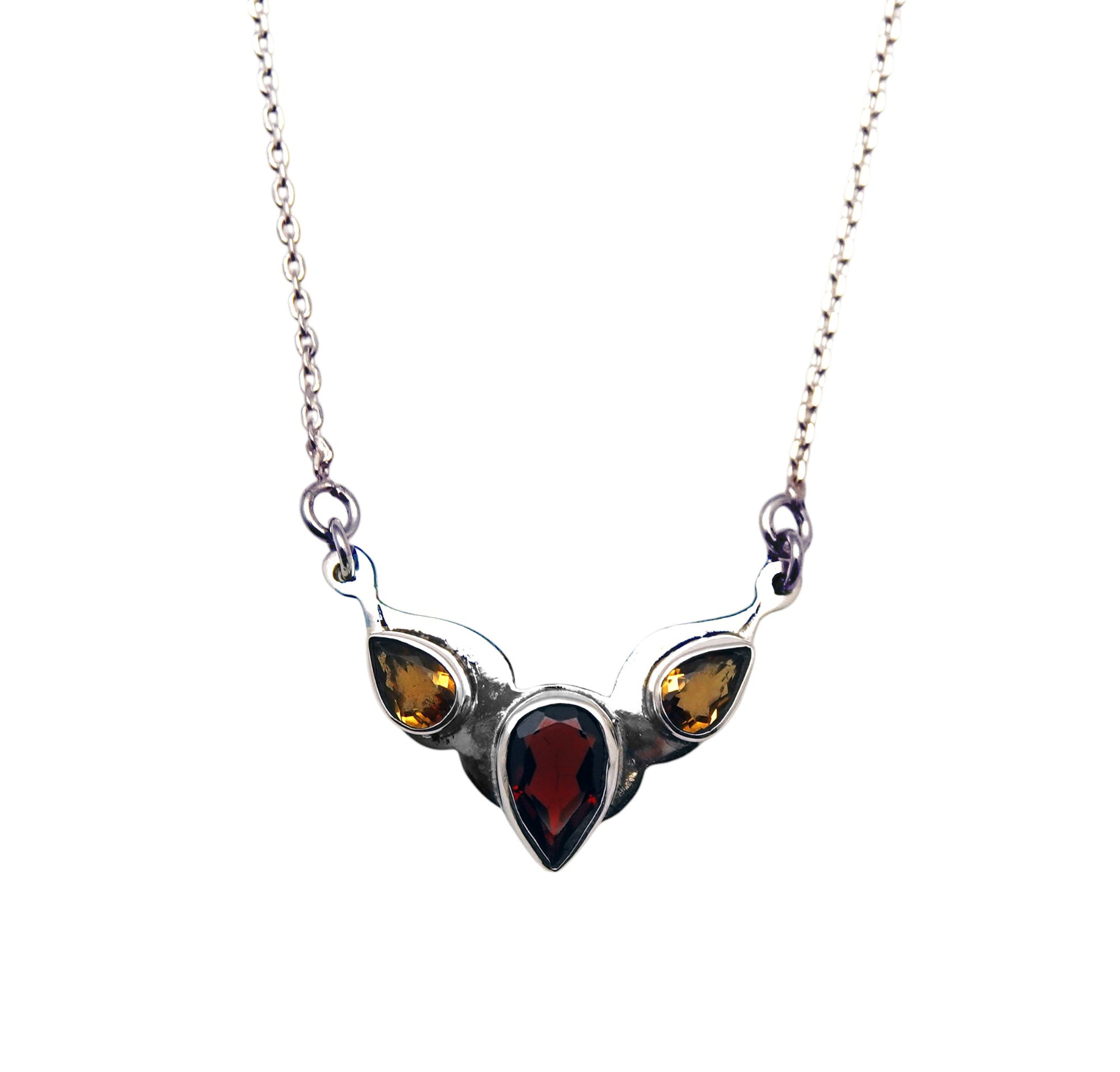 Cute, compact and tailored best describe this new addition to our neckwear line according to our customers. Normally we choose some of our most popular color combinations. However in this case we added a lesser seen combination to this instant classic as a complement to some current earring designs in need of a wardrobe partner. With a centerpiece measuring 1" across x 1/2" vertically, with gemstones that define its very essence, you will find it so easy to wear you'll hardly know you have it on. A perfect addition to round out your wardrobe as we head into a new season. Shown here in garnet and citrine.