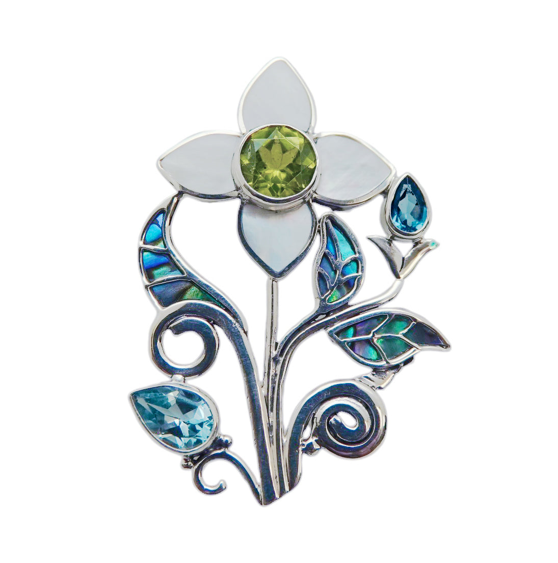 A beautiful remembrance as we look forward to the beauty of springtime, a time of rebirth seen in the brilliant colors of this pendant; in this case a natural faceted peridot framed by mother of pearl petals, paua leaves with blue topaz blooms to either side.