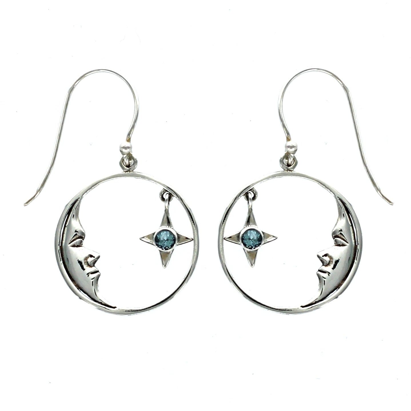 (294VBT) Blue Topaz Star and Silver Moon Drop Earrings