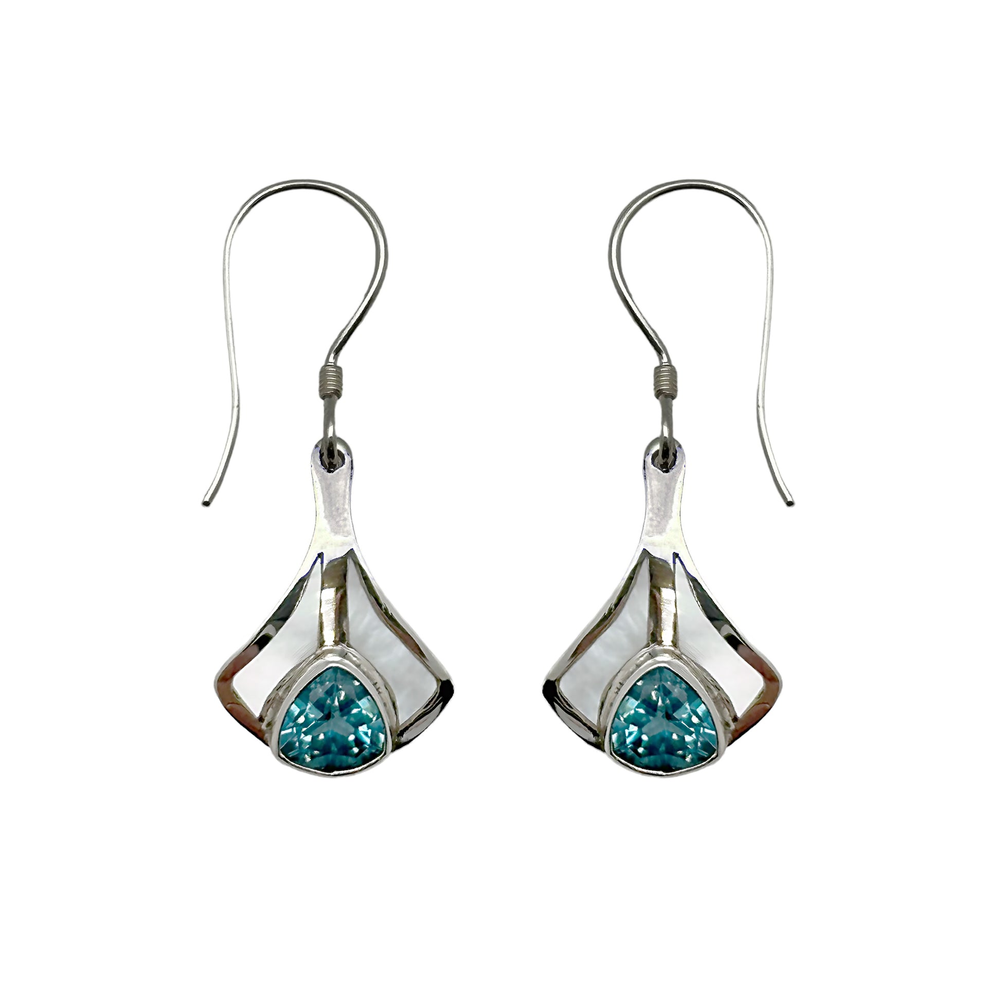Compact and sporty, these earrings show off a somewhat triangular silhouette, repeated in the 6mm trillion gemstone along with a beautiful mother of pearl inlay on either side.. Great for office, casual or evening wear. They're so comfy you'll hardly know you have them on. Shown here in Swiss blue topaz with mother of pearl.