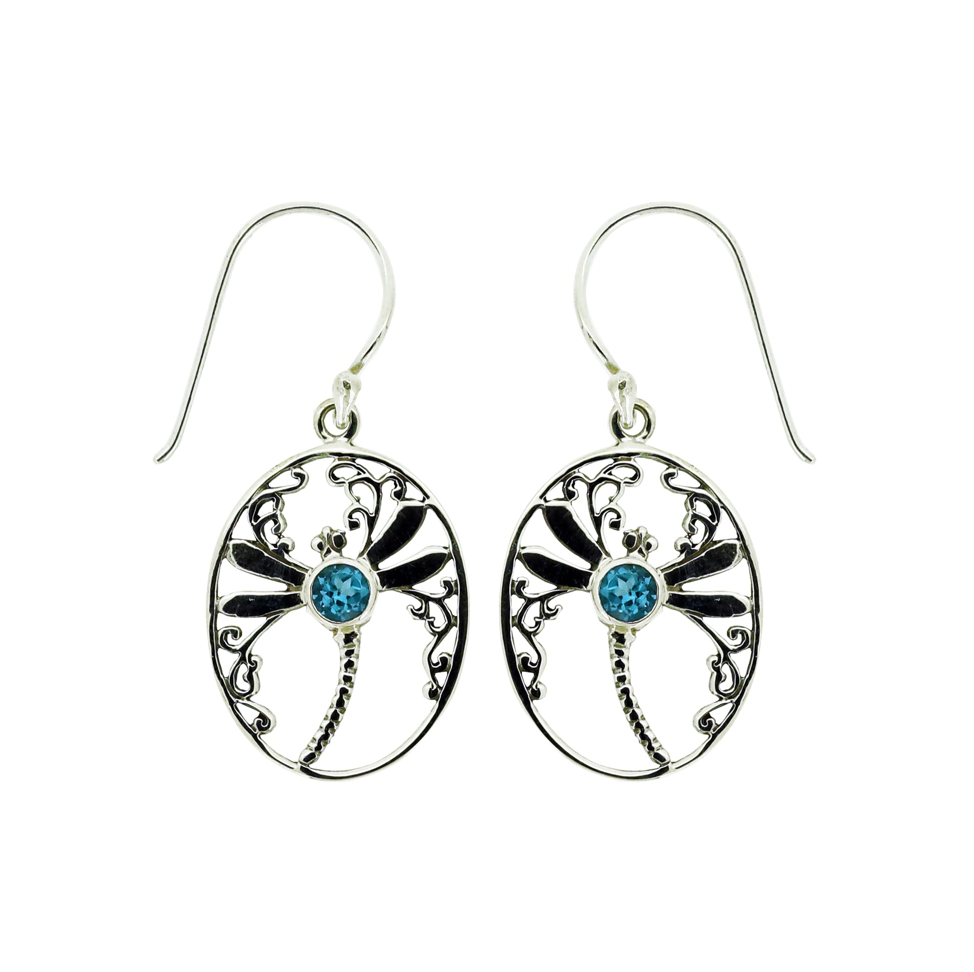 Oval Earrings with Dragonfly Motif, Shown Here in Blue Topaz