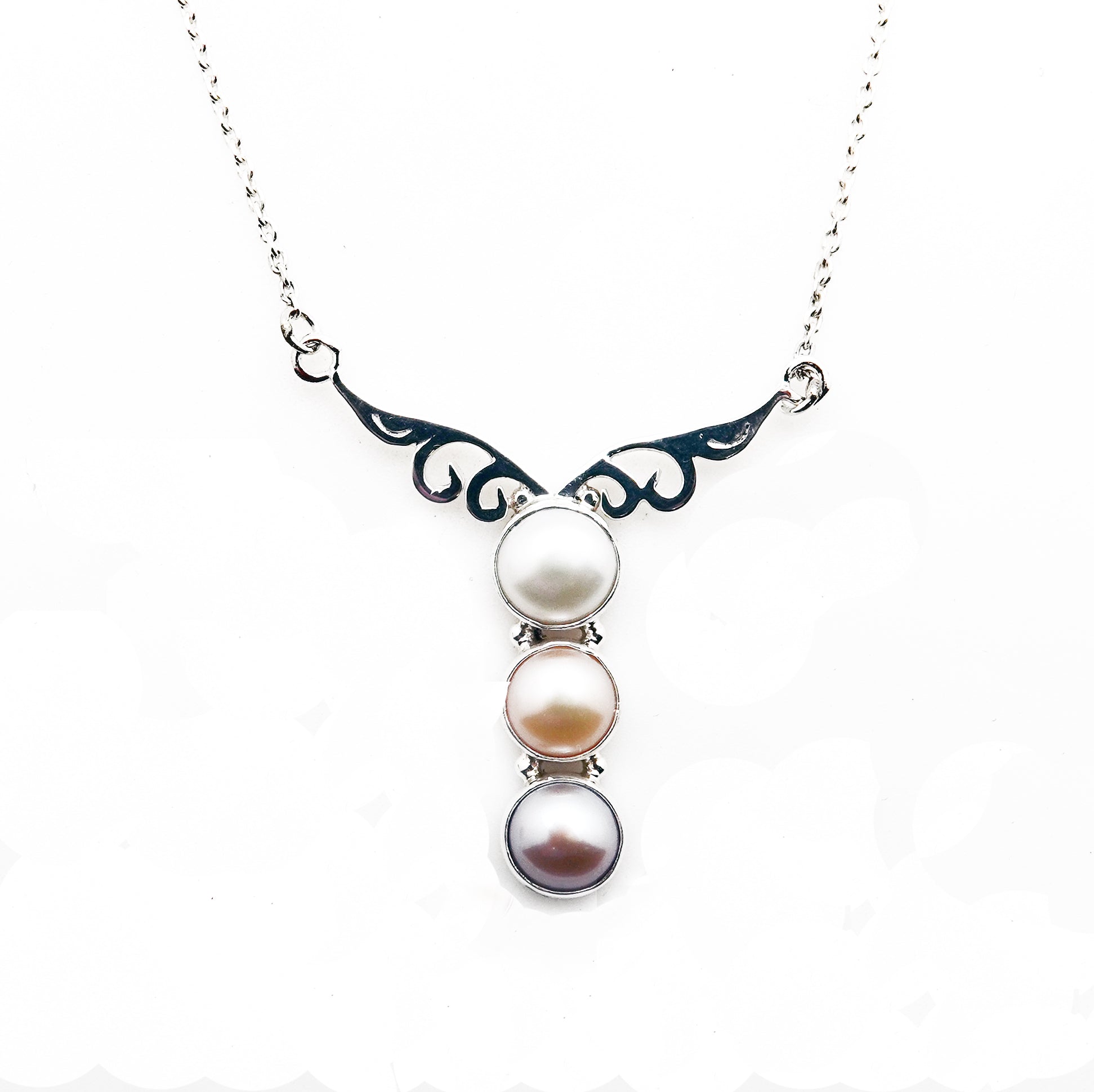 Adding a bit more depth to the classic winged necklace, this new design features 3 8MM round fresh water pearls in differing shades. Since these pearls are natural, not every one will look identical to this photo and yet all are quite distinctive, pairing up beautifully with our matching pearl earring (366BPL). We can send photos of your actual necklace ordered upon request. This necklace adjusts to fit from 16 to 18 inches.