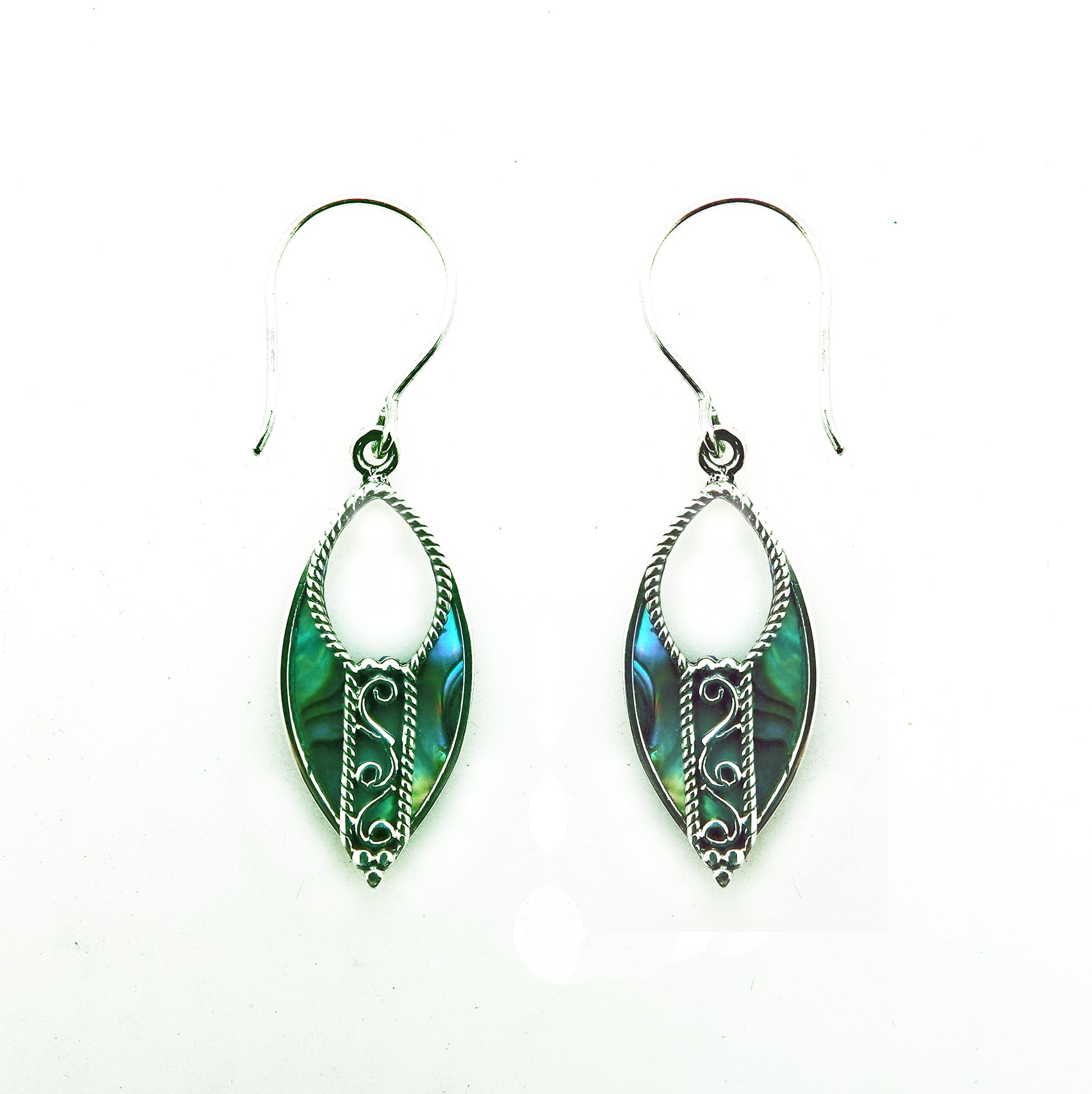 This graceful drop earring mimics the form and essence of our newest design in classic mold, the #350B, which comes in all silver and copper silver combination. This earring features paua shell from New Zealand (better known as abalone here in the states) framed in hand hewn sterling silver. It reflects a more classic shape and design, a new and yet timeless rendition.