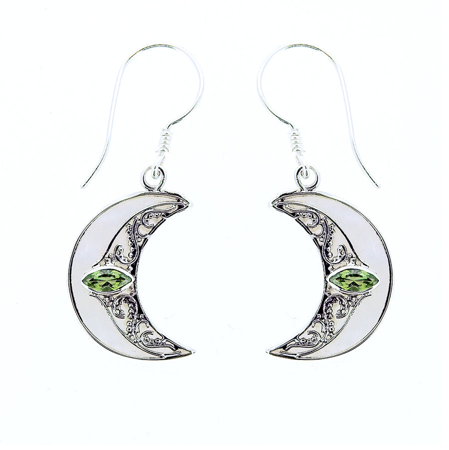 Peridot & Mother Of Pearl Crescent Moon Silver Earrings
