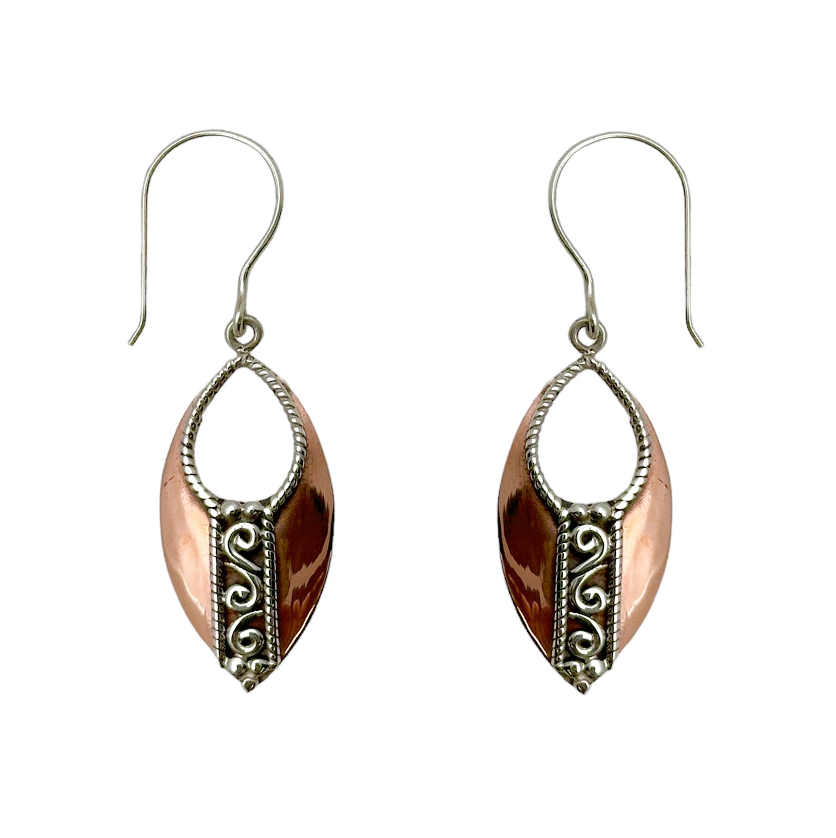 Employing classic Balinese elements of braided wire and scrollwork, we offer a somewhat more tapered version of the classic hoop, using a French hook to add the vibrance of motion: the swing and sway mirroring the eternal dance of nature - rustling leaves, sashaying of tall grasses in the fields... Everything that nature touches, touches us. Featured here in a combination of silver and copper.
