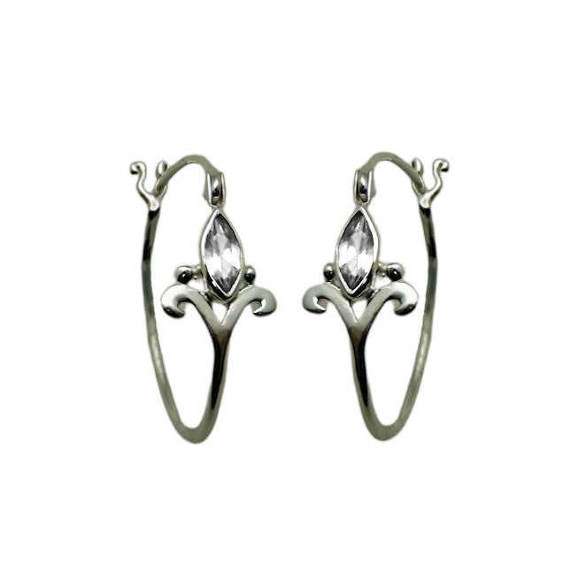 These graceful hoop earrings feature a marquise-cut Cubic Zirconia framed by a delicate crown-like scroll design in silver plate. Lightweight and elegant, they bring just the right touch of sparkle for everyday wear while adding a refined, regal accent to any style. Finished with Sterling Silver ear wires.