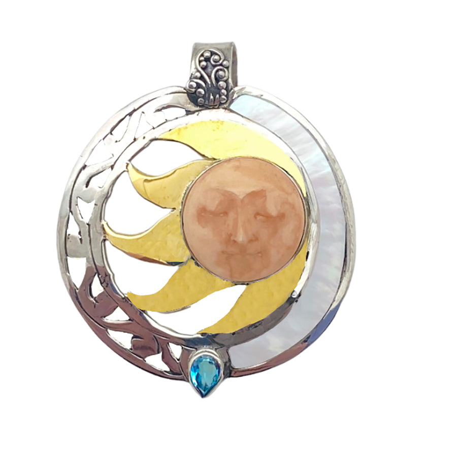 Tea Stained Bone Mother Of Pearl & Blue Topaz Pendant