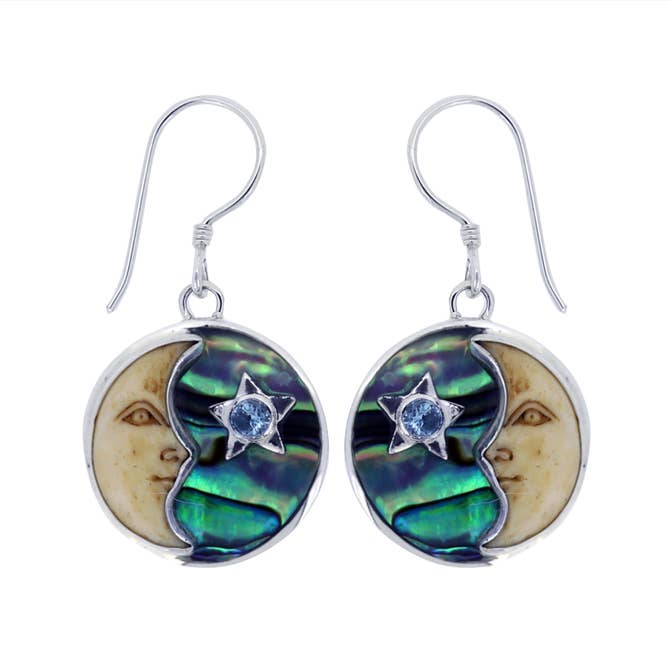 (290YBTPAUABFT) Tea carved crescent Moon Earrings with Paua & Blue Topaz