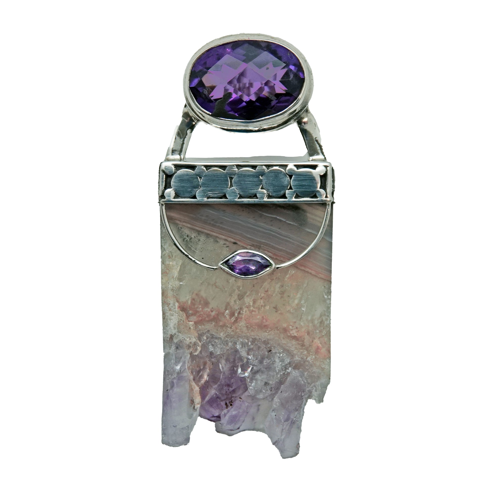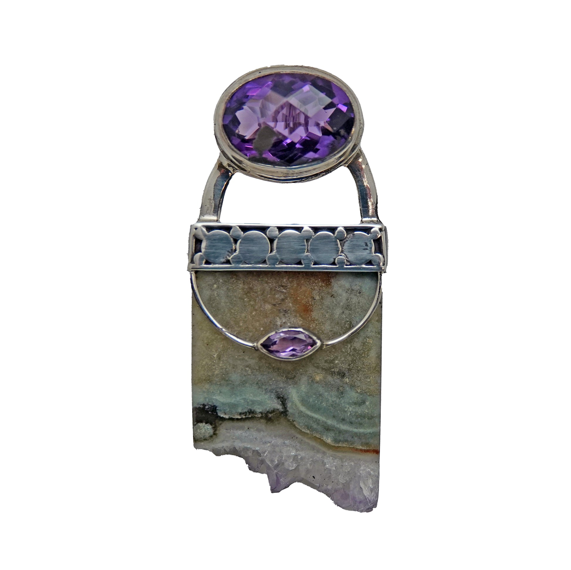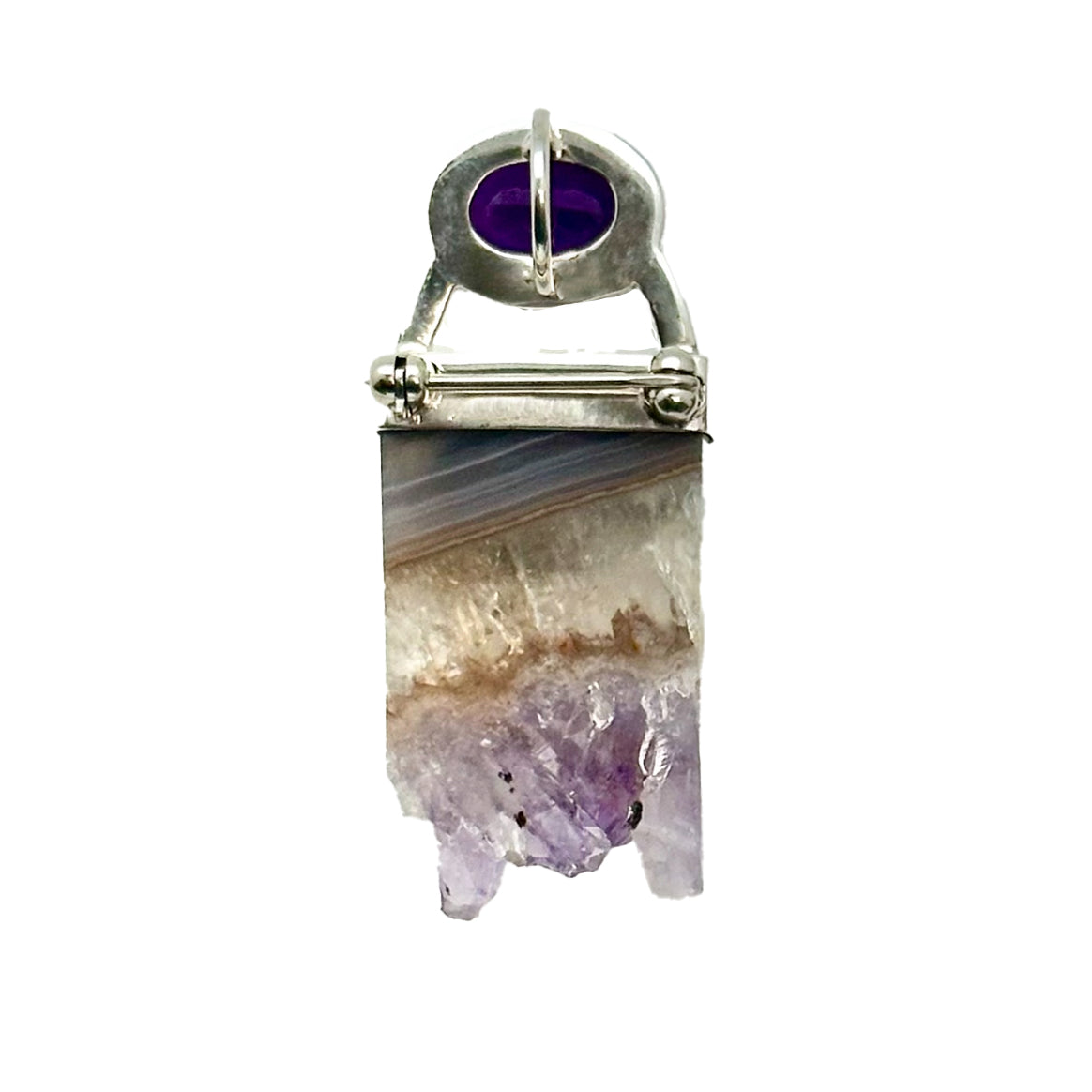 This sterling silver Uruguayan crystal pendant was designed as a mate to our popular earring from the same mines (209M). This pendant is mated to a 10x14 mm oval amethyst with another 3x6 marquise accenting beneath. It can also be worn as a brooche and has been a consistent best seller for several years. Since these slabs are sliced just as they come out of the earth, the sizes and shapes may vary as you can notice from our photos. Please keep this in mind when viewing the dimensions below as they can only be shown in approximate size.